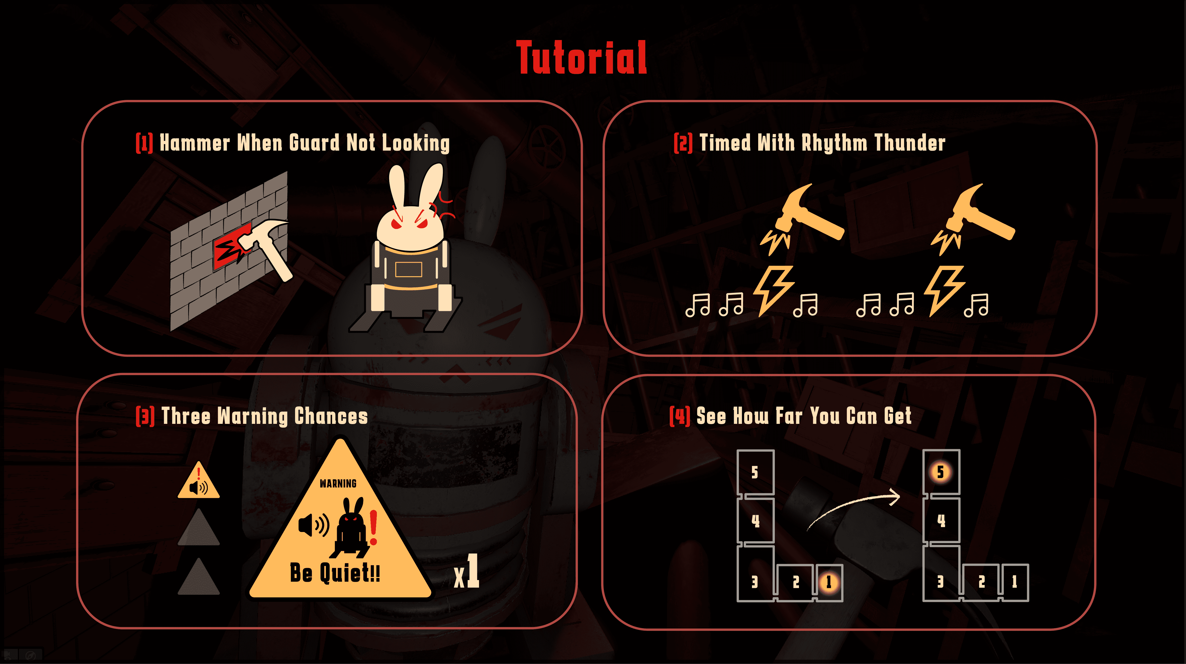 1. Hammer placed in front of the guard — screen-based red visual warnings and progress bar.