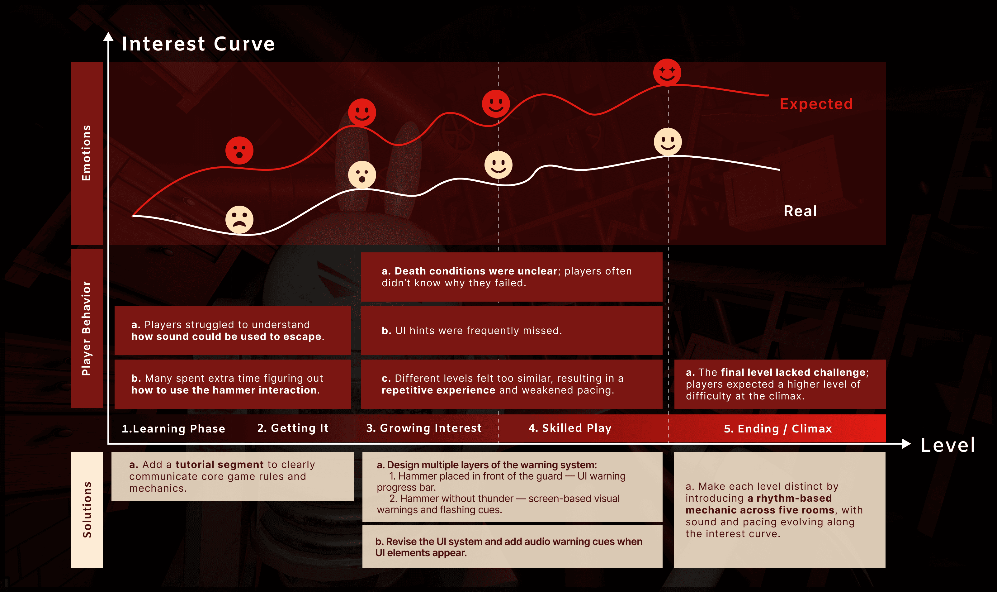 5a. Make each level distinct by introducing a rhythm-based mechanic across five rooms, with sound and pacing evolving along the interest curve.
